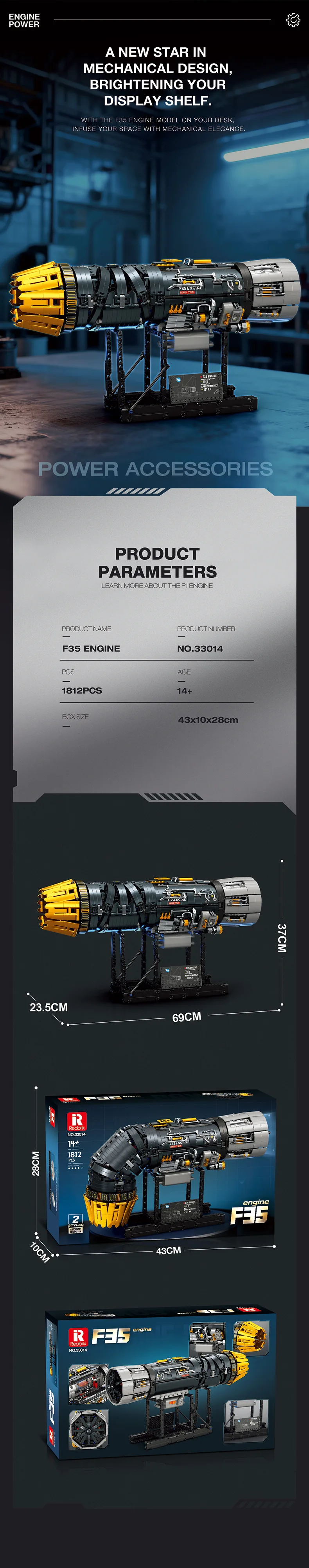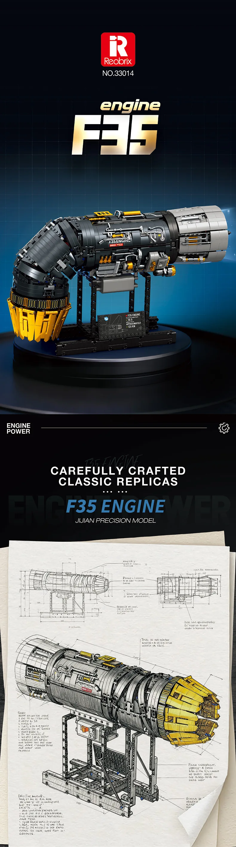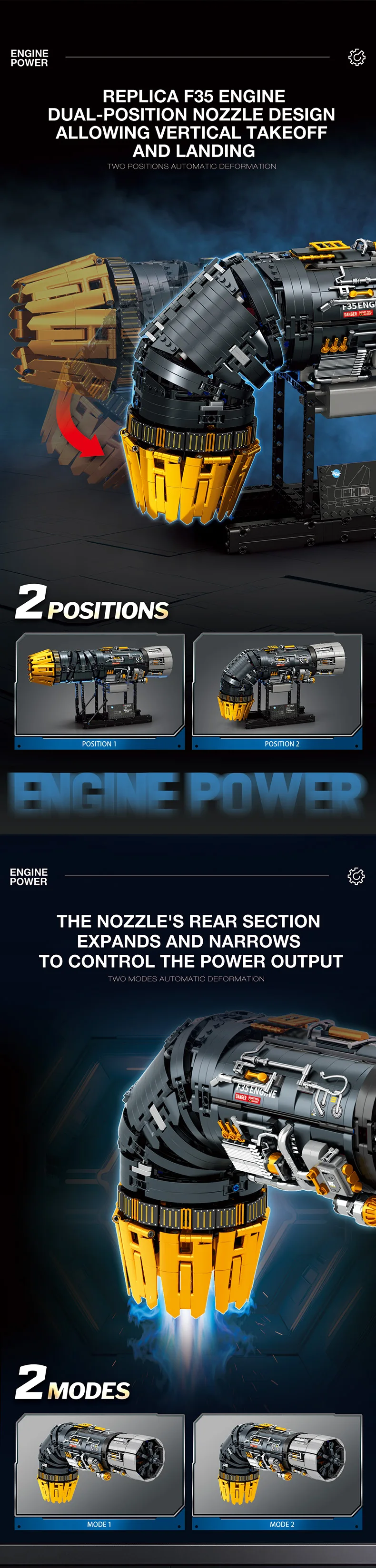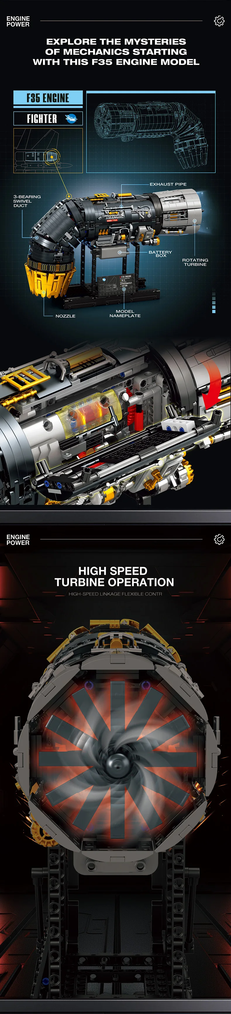 ✈️ 1:17 Scale F35B Engine Core Replica: Built with 1812 precision bricks, this model recreates the turbofan engine core of the F35B fighter jet in an impressive 1:17 realistic scale. The standout feature is the 90° deflectable tail nozzle, accurately simulating the iconic vertical takeoff and landing (VTOL) capability of the F35B aircraft.
